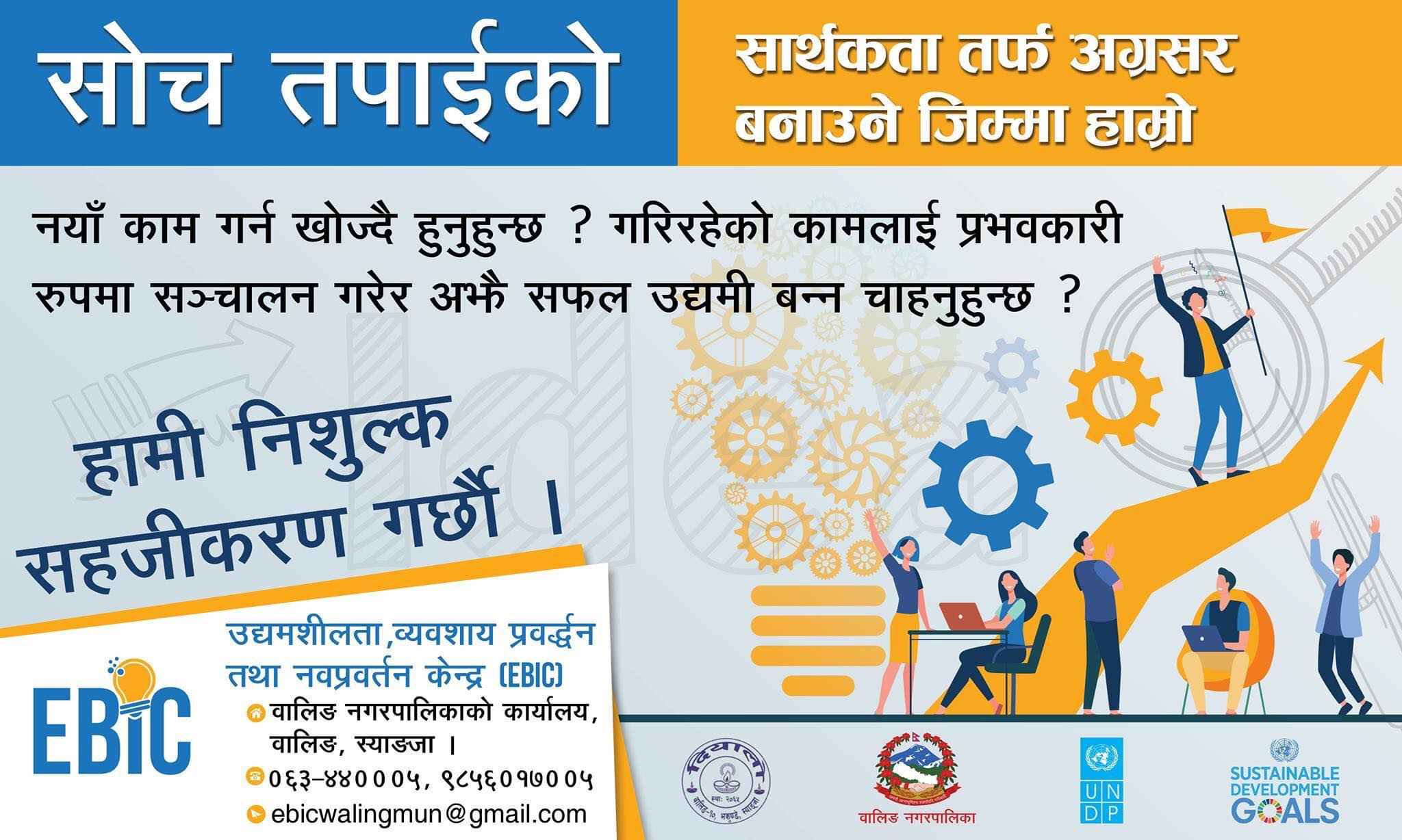 के तपाईले आफ्नै व्यवशाय शुरु गर्ने सोच बनाउनु भएको छ ? के आत्मनिर्भर बन्दै सफल उद्यमी बन्न चाहानु भएको छ ? अव के गर्ने र कसरी काम गर्ने भन्नेमा अलमलमा पर्नु भएको छ ? उद्यमशीलता,व्यवशाय प्रवद्र्धन तथा ईन्नोभेटिभ आईडियाका बारेमा जानकारी लिन चाहानुहुन्छ ? वालिङ नगरपालिकामा रहेको उद्यमशीलता व्यवशाय प्रवर्द्धन तथा नवप्रवर्तन केन्द्र (EBIC) मा सम्पर्क गर्नुहोस् । सेन्टरले तपाईलाई महत्वपूर्ण सहजीकरण गर्नेछ ।
