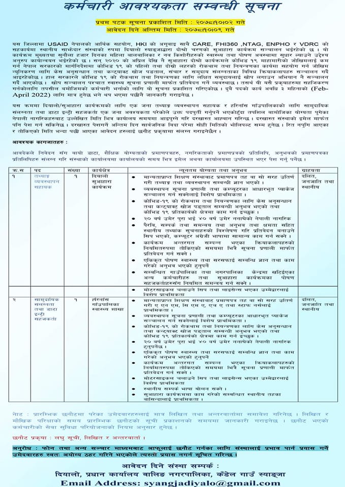 रोजगारीको अवसर/कर्मचारी आवश्यक्ता सम्वन्धी सूचना ।